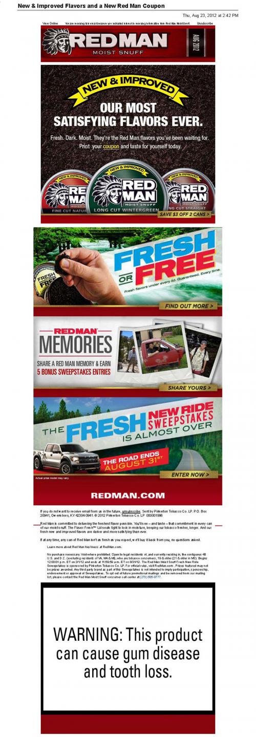 Email from Red Man received in August 2012, promoting the "new and improved," flavors of their moist snuff line.The email prompts the receiver to visit the brand website in order to redeem a $3.00 of 2 cans coupon offer. It also, reminds the receiver that the Fresh New RIde Sweepstakes will be ending August 31st.