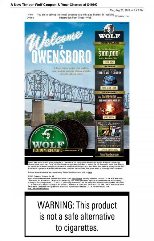 Email from Timber Wolf received in August 2012 promoting the Welcome to Owensboro Sweepstakes. The email also, directs the receiver to the brand website to redeem a coupon offer and to read stories about the people/places of Owensboro, Kentucky.