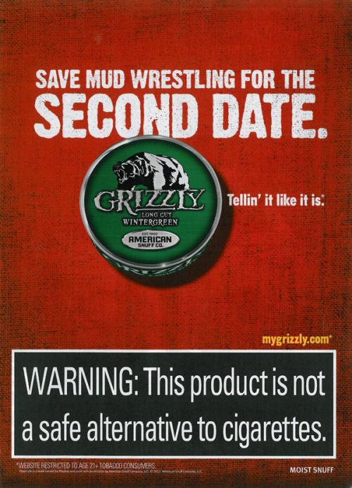 Grizzly ad in promotion of the long cut, wintergreen style. Text:"Save mud wrestling for the second date."