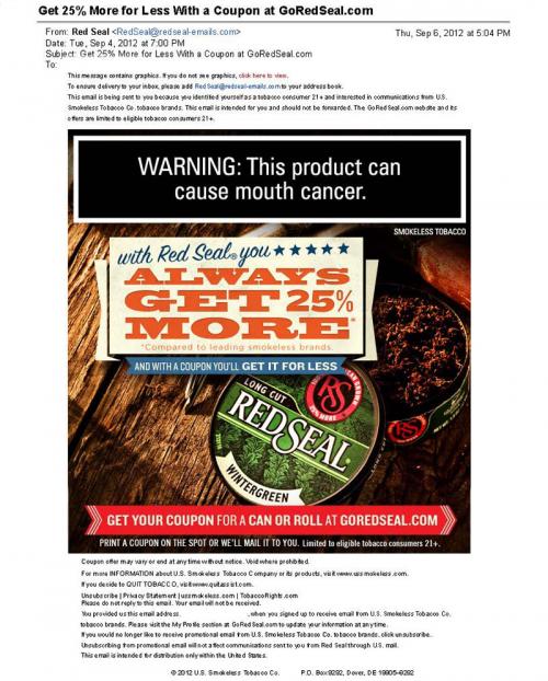 Email from Red Seal received in September 2012 promoting the long cut wintergreen style, as well as the value of purchasing Red Seal over other smokeless brands. Text: With Red Seal you always get 25% more compared with leading smokeless brands and with a coupon you'll get it for less.