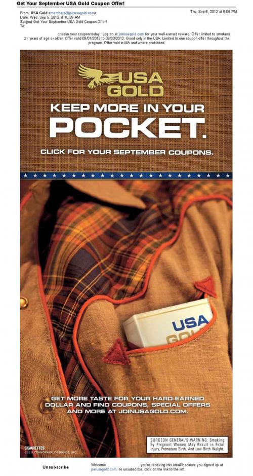 Email from USA Gold received in September 2012 reminding the receiver to visit the USA Gold website for monthly coupons.