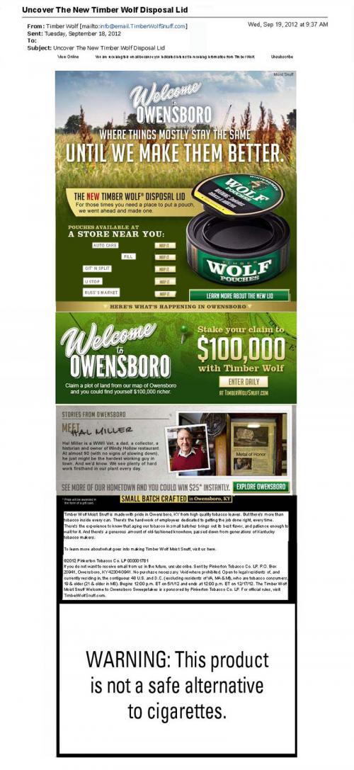 Email from Timber Wolf received in September 2012 promoting the disposal lid, where up to two used pouches can be stored, as well as the Welcome to Owensboro Sweepstakes.
