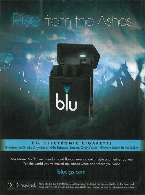 Ad promoting Blu electronic cigarettes (also known as e-cigarettes). The ad features a large bold image of a smart pack amidst a concert or club setting. Text: "Rise from the Ashes" "You smoke. So did we." "Freedom and flavor never go out of style and neither do you." "Tell the world you've moved up, smoke when and where you want."
