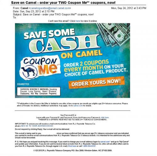 Email from Camel received in September 2012 reminding the receiver that they can order 2 coupons per month for any Camel product at camel.com.
