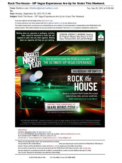 Email from Marlboro received in September promoting the latest sweepstakes, the Biggest Night of the Year. The email asks the receiver to send a playlist to "make the crowd move," for a chance to win.