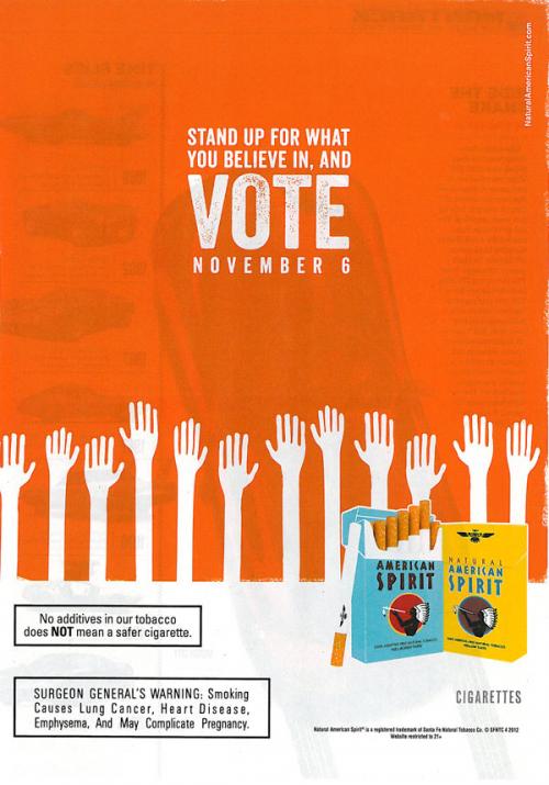 Bright orange American Spirit ad encouraging others to vote on November 6th 2012. The main text states: "Stand Up For What You Believe In, And VOTE November 6"
