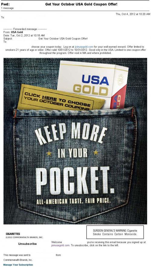 Email received from USA Gold in October 2012 inviting the receiver to choose coupons for the month of October. Text: "Click here to choose your october coupons." "Keep more in your pocket; All-American tase. Fair price."