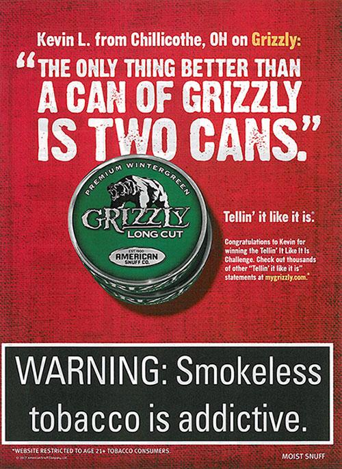 Grizzly Ad promoting their premium wintergreen longcut product; the ad also congratulates the winner of the Tellin' it like it is challenge, whose quote is featured in the ad. Text: "Kevin L. from Chillicothe, OH on Grizzly: The only thing better than a can of grizzly is two cans. Tellin' it like it is."