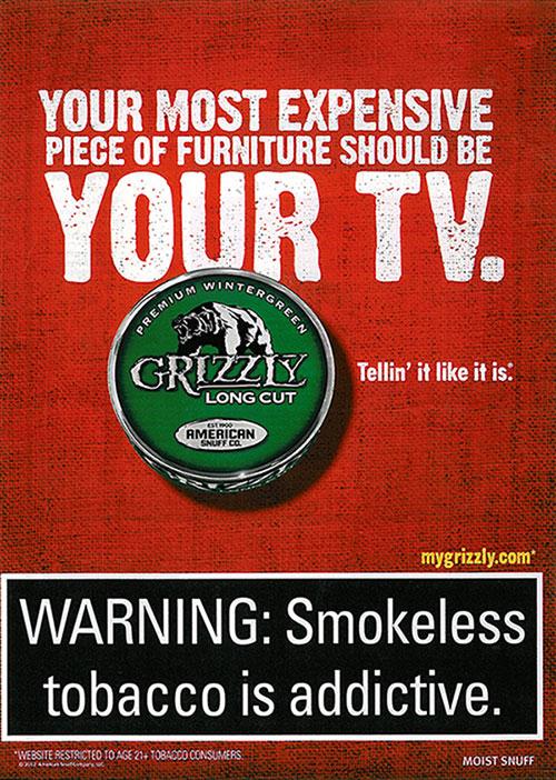 Grizzly Ad promoting their premium wintergreen long cut product. Text: "Your most expensive piece of furniture should be your TV. Tellin' it like it is."