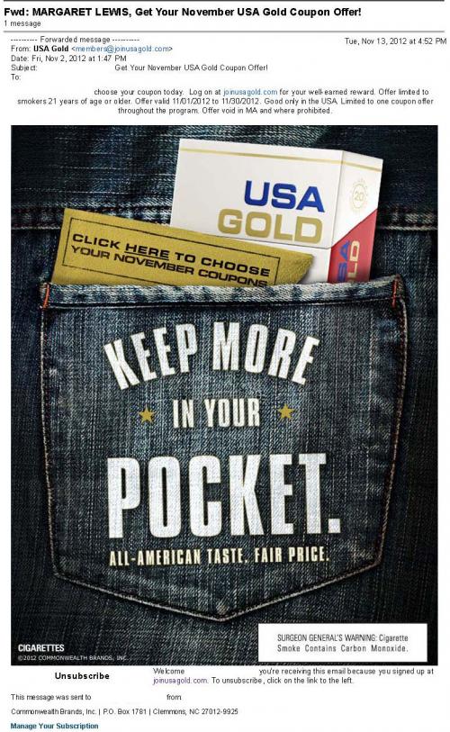 Email received from USA Gold in November 2012 inviting the receiver to choose coupons for the month of October. Text: "Click here to choose your November coupons." "Keep more in your pocket; All-American tase. Fair price."