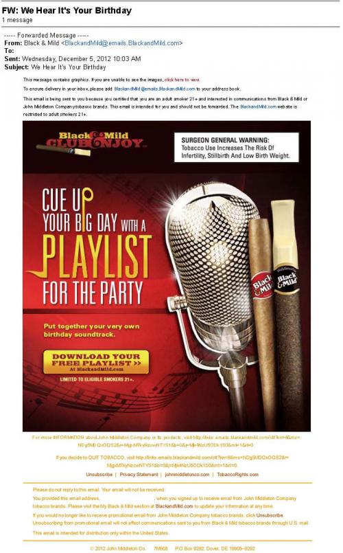 Birthday-themed email from Black and Mild received in December 2012. The email wishes the receiver a happy birthday and offers a download of a free music playlist. Text: "Cue up your big day with a playlist for the party. Put together your very own birthday soundtrack."