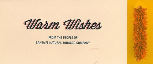Direct mail holiday greeting card received in December 2012 from Santa Fe Natural Tobacco Company. Text: "Warm Wishes from the people of Santa Fe Natural Tobacco Company."