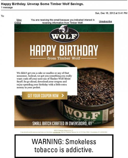 Email received in December 2012 from Timber Wolf wishing the receiver a happy birthday and offering a coupon.