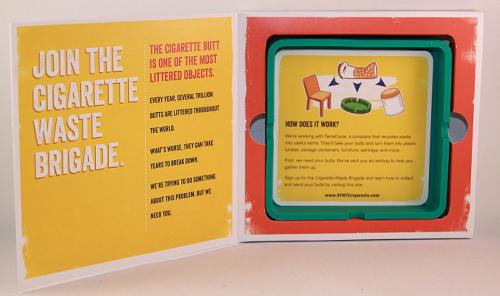 Direct mail peice received by American Spirit in December 2012. The peice consists of an open-flap box with information on cigarette butt recycling. Inside is a rubber ash-tray for the receiver to store his/her butts and then send them in for recycling. Text: "Make your butt useful. Join the cigarette wase brigade."