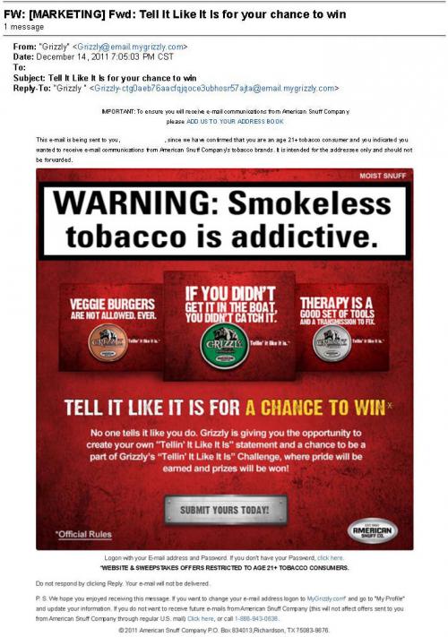 Email from Grizzly received in December 2011 promoting their "Tellin' it like it is" sweepstakes and urging the receiver to "Tell it like it is for a chance to win."