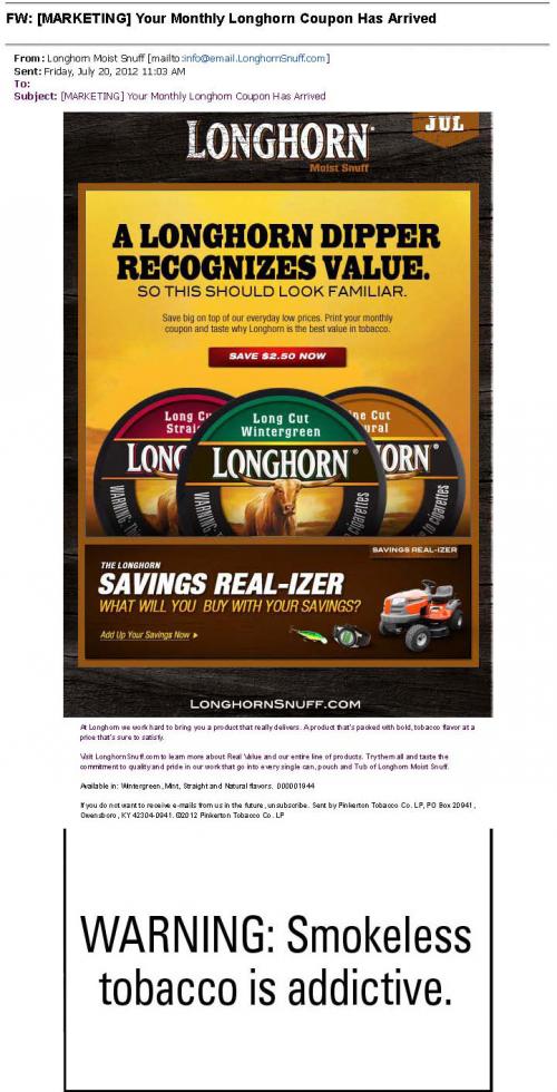 Email received from Longhorn in July 2012 offering a coupon and inviting the receiver to add savings online. Text: "A Longhorn dipper recognizes value. So this should look familiar."