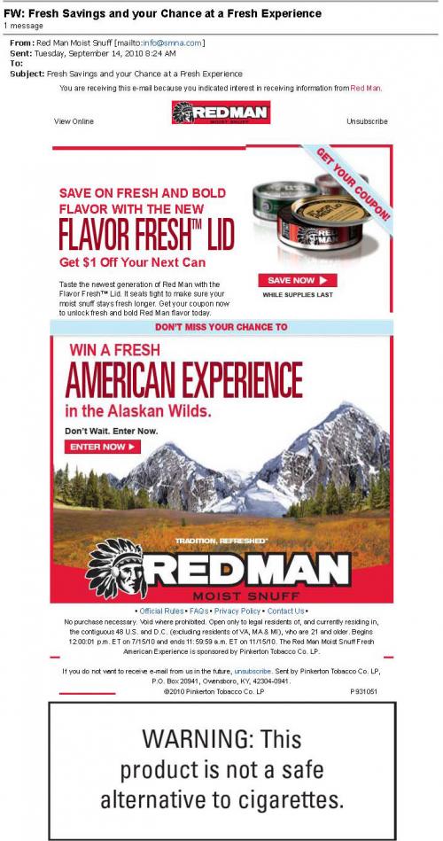 Email received from Red Man in September 2010 promoting their new "flavor fresh" lid and American experience sweepstakes; the email also offers a coupon.