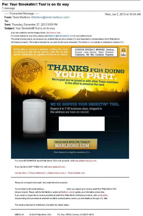 Email received from Marlboro in January 2013 thanking the receiver for participation in Team Marlboro efforts and confirming shipment of a free smoke tin. Text: "Thanks for doing your part. We're glad you've joined in with other Team members in the effort to preserve the land."