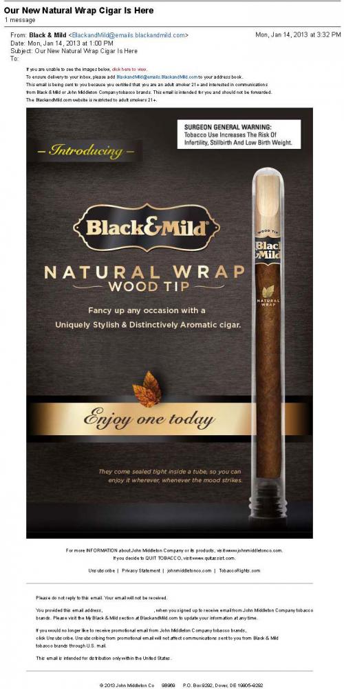 Email received from Black and Mild in January 2013 introducing their new "Natural Wrap Wood Tip" product. Text: "Fancy up any occasion with a uniquely stylish & distinctively aromatic cigar."