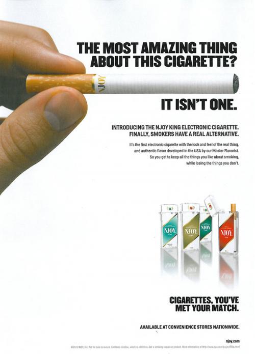 Ad from NJOY promoting their new E-cigarette brand. Text: "The most amazing thing about this cigarette? It isn't one."