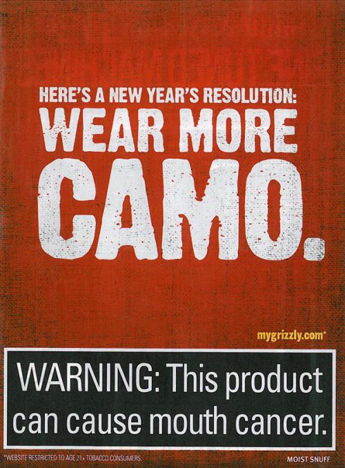 Tellin' it like it is ad from Grizzly promoting their long cut premium wintergreen product. Text: "Here's a New Year's resolution: wear more camo."