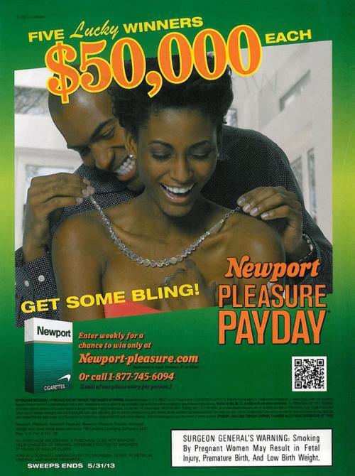 Newport ad featuring an African American couple, promoting their Pleasure Payday sweepstakes. Text: "Five lucky winners, $50,000 each."