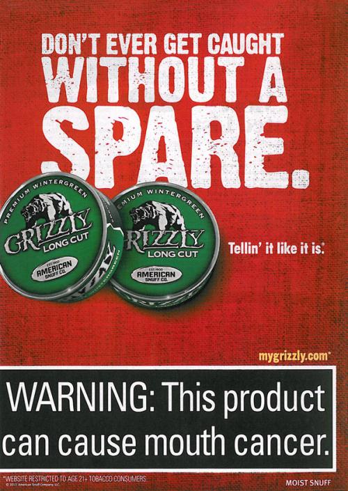 "Tellin' it like it is" Grizzly ad promoting their premium wintergreen, long cut product. Text: "Don't ever get caught without a spare."