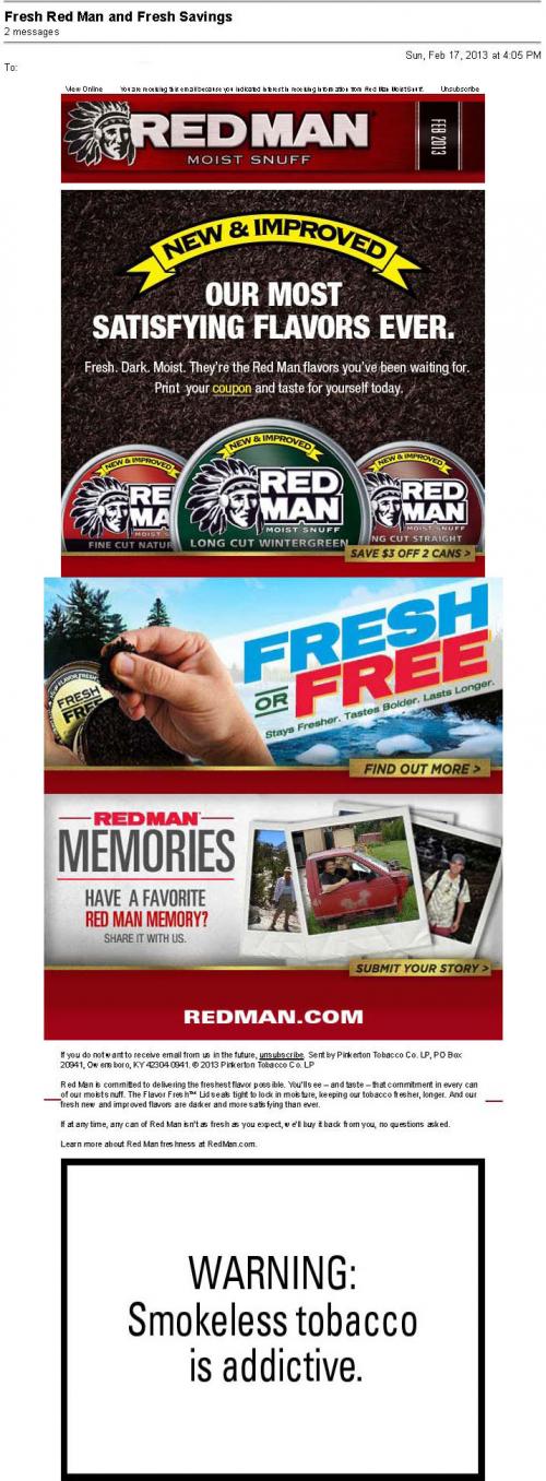Email received in February 2013 from Redman promoting various flavored products, offering a coupon, and inviting the receiver to Redman.com to find out more information and share Red Man memories. Text: "New and improved. Our most satisfying flavors ever."