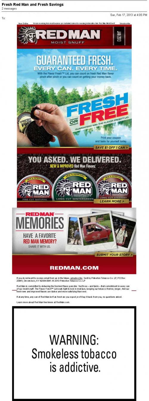 Email received from Red Man in January 2013 promoting their "flavor fresh" lid, new and improved flavors, and inviting the receiver to share "Red Man memories" on Redman.com. Text: "Guaranteed fresh. Every can. Every time."