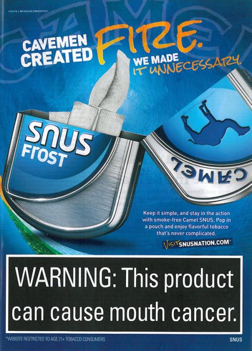 Ad from Camel Snus promoting their Frost brand. Text: "Cavemen created fire. We made it unnecessary."