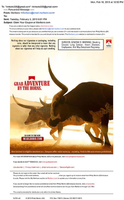 Email received from Marlboro on in February 2013 inviting the receiver to visit the website. Text: "Grab Adventure By the Horns"