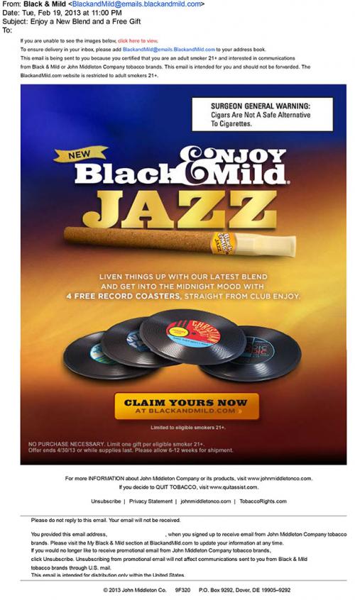 Email received on February 2013 prompting receiver to claim free gift on website. Text: "Liven things up with our latest blend and get into the midnight mood with 4 free record coasters, straight from Club Enjoy."