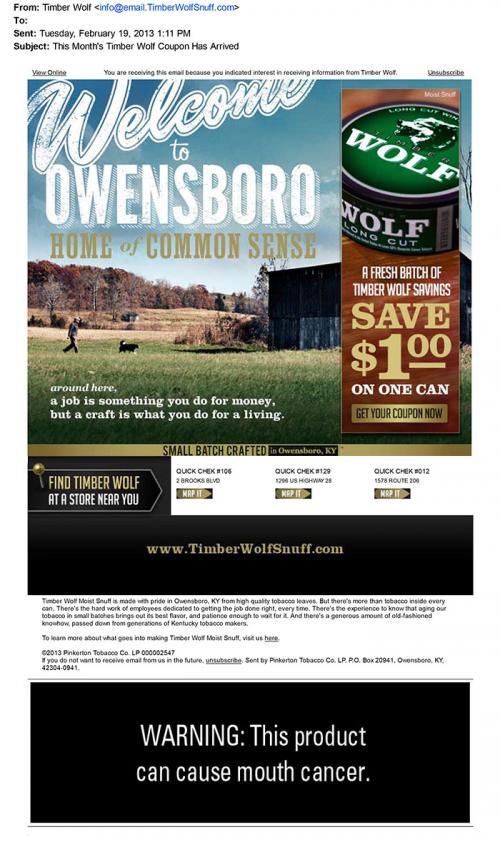 Email received from Timber Wolf in February 2013 with coupon and locations near receiver where Timber Wolf is sold.