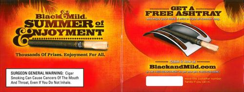Direct mail piece from Black & Mild received in October 2012 promoting their "Summer of Enjoyment" sweepstakes, inviting the receiver to blackandmild.com to claim a gift, offering prizes, and a coupon.