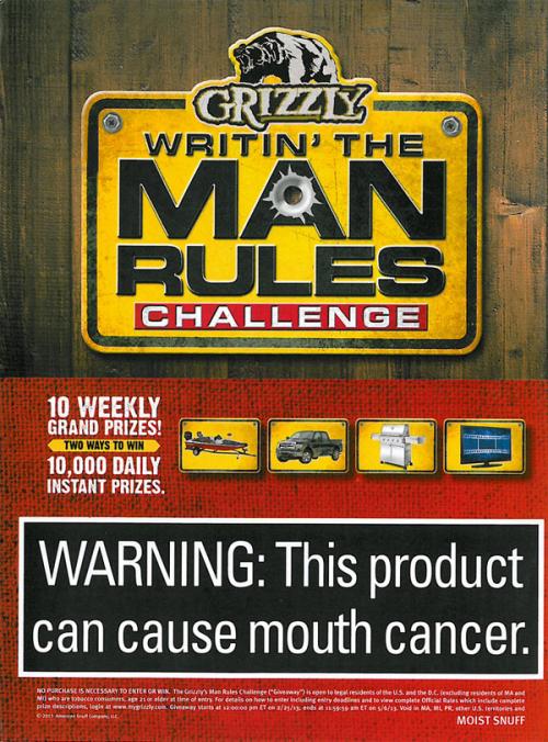 Grizzly ad promoting their Premium Wintergreen, Long Cut product and the "Writin' the Man Rules Challenge" sweepstakes. Text: "Man Rule #1: Make Your Own Rules." This ad does not include a sweepstakes start date.