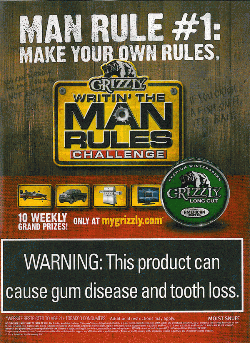 One page Grizzly ad promoting their "Writin' the Man Rules Challenge" sweepstakes and Premium Wintergreen, Long Cut product. Text: "Man Rule #1: Make Your Own Rules."
