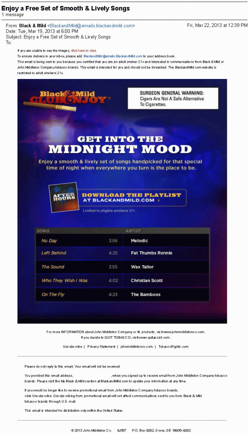 Email received from Black and Mild in March 2013 inviting the receiver to "get into the midnight mood" by logging onto Blackandmild.com and downloading a handpicked playlist of songs. Text: "Enjoy a smooth & lively set of songs handpicked for that special time of night when everywhere you turn is a place to be."