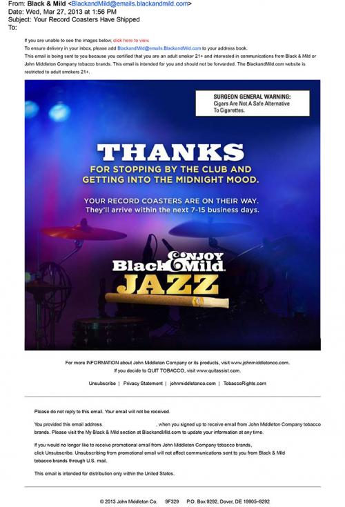 Black & Mild email received in March 2013 letting recipient know that the gift is on its way.