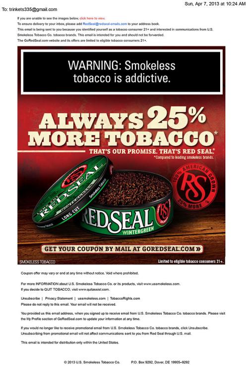 Red Seal email received in April 2013 with a link to order coupons online. Red Seal advertizes 25% more tobacco as their hallmark promise.