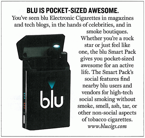 1/6 page magazine ad promoting Blu electronic cigarettes (otherwise known as e-cigarettes) found in the dedicated commercial section toward the end of the magazine. The ad contains an image of a smart pack and text regarding the social desirability of Blu, as well as the brand website address.