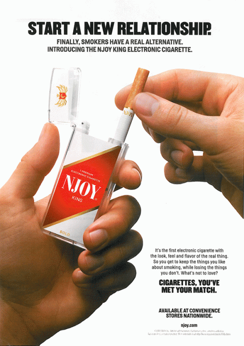 NJOY ad promoting the authenticity of their electronic cigarette. Text: "Start a new relationship. Finally, smokers have a real alternative. Introducing the NJOY King Electronic Cigarette."