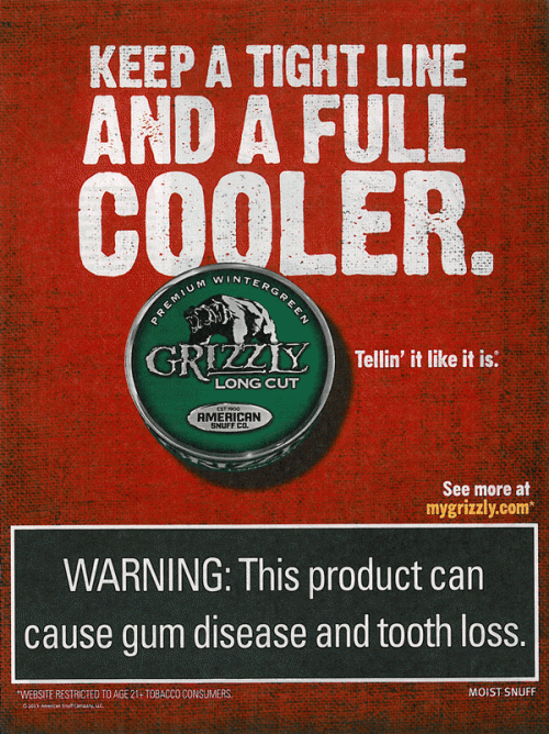 Grizzly ad promoting their Premium Wintergreen, Long cut product and prompting the reader to see more at mygrizzly.com. Text: "Keep a tight line and a full cooler."