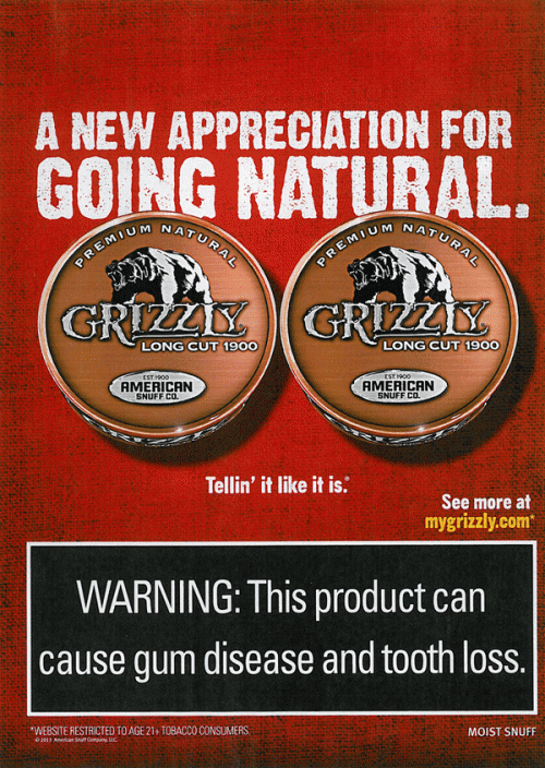 Grizzly ad promoting their Premium Natural, Long Cut 1900 product and prompting the reader to see more at mygrizzly.com. Text: "A new appreciation for going natural."