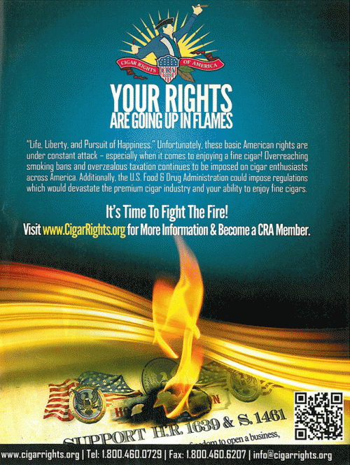 Ad from Cigar Rights of America advocating for less restrictions on smoking, including taxes and other bans. The ad encourages the reader to visit www.CigarRights.org for more information and to become a CRA member. Text: "Your rights are going up in flames. It's time to fight the fire!"