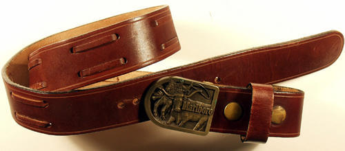 Brown leather Marlboro belt with brass buckle. Cowyboy on horseback lassoing steer depicted on belt buckle.
