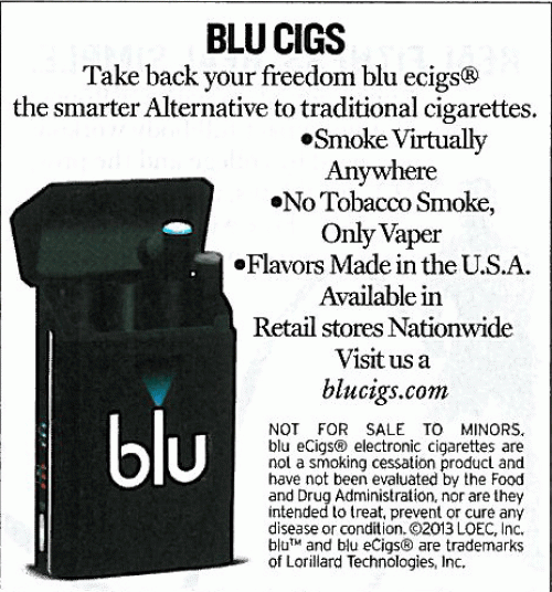 1/12 page ad from Blu promoting their product as a safer alternative to cigarettes. Text: "Take back your freedom blu ecigs; the smarter Alternative to traditional cigarettes."