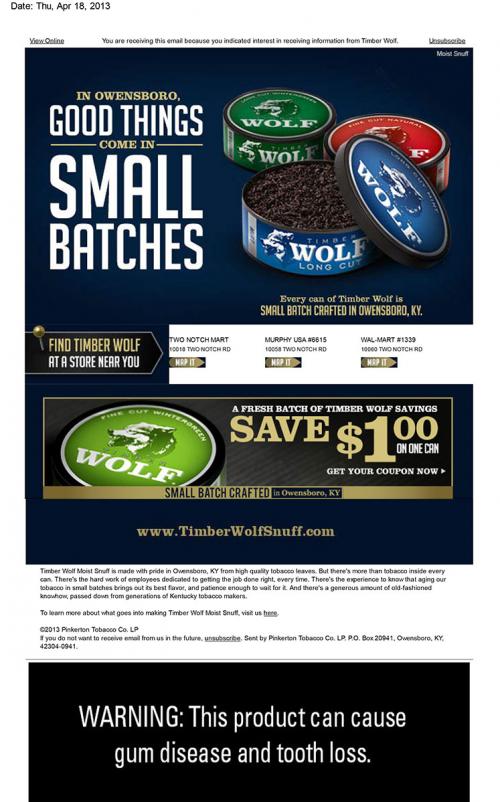 Timberwolf email received in May 2013 with coupon and locations of the nearest vendors that sell Timberwolf products.
