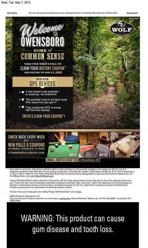 Coupon - Discount E-mail Smokeless Tobacco Sweepstakes