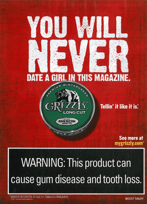 Grizzly ad promoting their Premium Wintergreen, Long Cut product and inviting the reader to see more at Mygrizzly.com. Text: "You will never date a girl in this magazine."