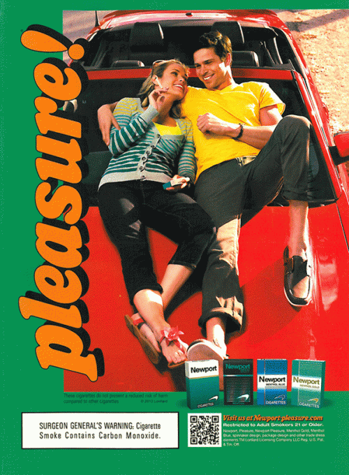 Newport ad featuring a young couple relaxing on the hood of their car, smoking Newport cigarettes. Text: "Pleasure!"
